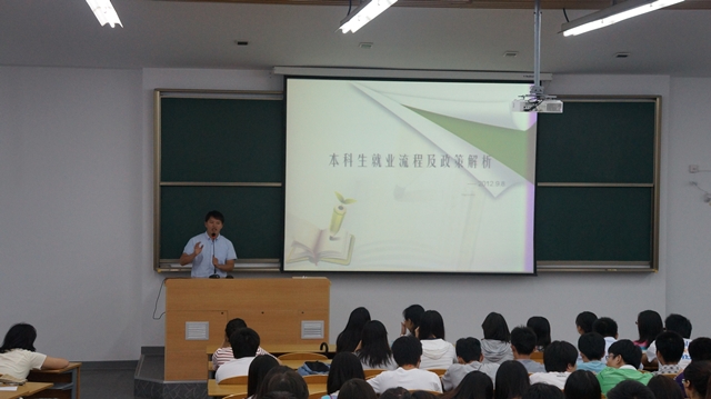 为推进成人导航 2013届毕业生就业指导工作的开展,让学生了解就业流程及政策,缓解毕业学生在面对严峻就业形势时的紧张情绪,鼓励学生以积极的心态面对职场的考验,成人导航 于9月9日晚20:30在教学楼3D209召开了本科生就业动员大会,成人导航 毕业班辅导员刘建老师、范晓云老师以及2013届毕业生参加了本次大会。刘建老师为大家做了关于就业流程与政策的讲座。