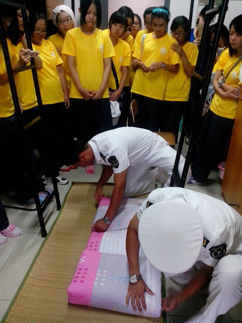 2012年9月13日下午,经过三天军训的考验之后,在第四天教官们来到成人导航 男女生寝室进行整理内务教育,为我们交运专业的学生们讲解了寝室的正规整理要求并亲自进行示范。