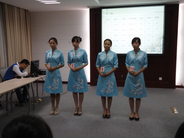 本次复试均要求学生在前期完成化妆、盘头等基本准备工作,着礼仪队旗袍依次进行面试,面试分为自我介绍和情景模拟两个环节。通过同学们的自我介绍和对礼仪队工作的看法,了解学生的谈吐和文化素养。情景模拟分为迎宾和颁奖两个场景,从站姿、走姿几个动作对学生的形体进行严格筛选。最终在几位评委老师的认真筛选下,选拔出15名同学进入礼仪队,我们也将在后期对新进同学进行专业培训。
