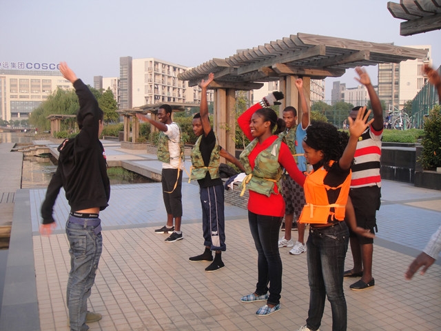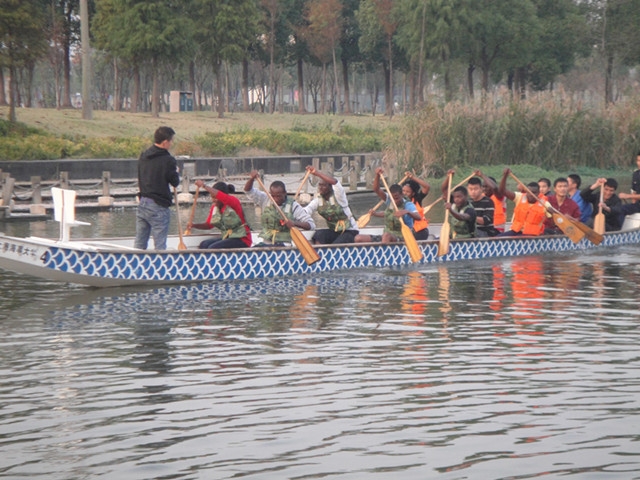 ur2young 在 周三, 11/28/2012 - 14:06 提交 2012年10月31日下午,交运学院组织加纳班留学生来到我校龙舟社学习划龙舟。 同学们首先穿上救生服并做了热身运动。然后宋海龙教练向留学生讲解了如何持桨、坐姿等基本动作。接下来留学生们跃跃欲试,坐进了龙舟里。宋教练特地安排几名龙舟队队员一同坐上船以防意外。河面顿时翻起了阵阵水浪,龙舟开始稳稳地向前划行。 本次学习活动在一片欢声笑语中结束,各位留学生特地询问了什么时间能够再次来龙舟社学习。作为一项富有特色的传统民俗文化活动,端午赛龙舟对于外国留学生具有独特的吸引力。
