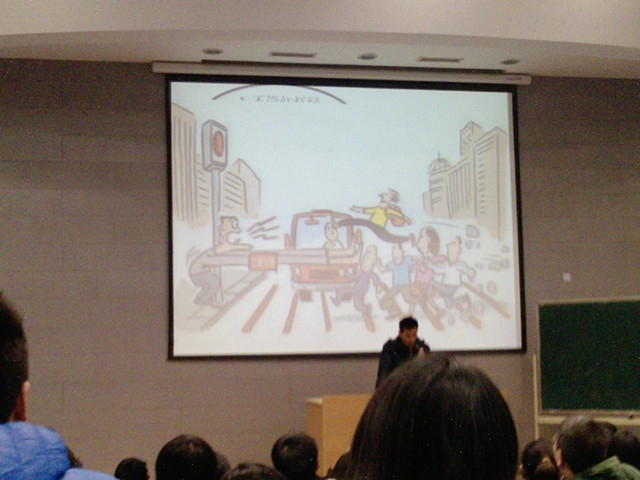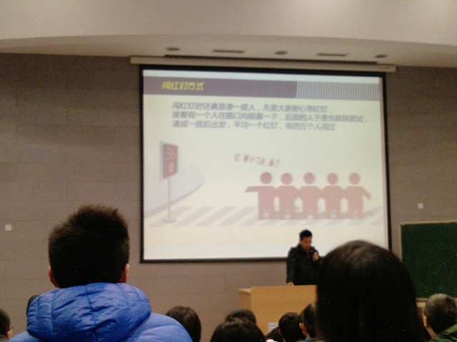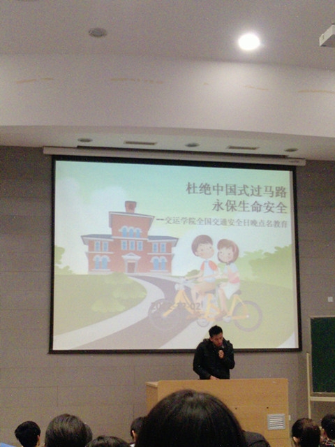 2012年12月2日是全国交通安全日,为了更好地向同学们宣传交通安全教育,交运学院管理系10级在2C101开展了题为“杜绝中国式过马路”的安全教育主题晚点名。晚点名由辅导员郝海光来主持。