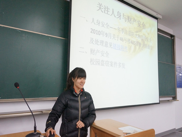 陈莉老师首先就近些年来大学校园内频频出现的安全问题举了很多实例,以例为鉴,引起大家对校园安全的重视;随后陈莉老师从人身安全和财产安全两个角度提醒同学们要加强冬季消防安全的防范及自身的财务的保管;最后陈莉老师结合同学们的实际情况,强调了寝室的用电安全问题,督促大家杜绝违规电器的使用,减少安全隐患的出现。