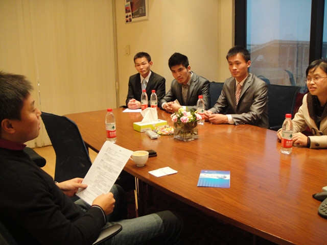 赵林和姚海先生首先介绍了挪威罗伦胜公司企业概况、企业选人标准以及企业应对经济整体形势低迷的方案。赵睿老师介绍了成人导航 概况和今年毕业班同学整体情况,并了解了目前在此企业实习的国航092班陈冬华等3名同学的工作情况。赵林和姚海先生还对走访同学提交的简历进行了点评并回答了同学们关于职业发展、船舶经纪行情等方面的问题。