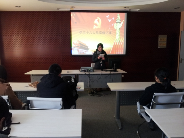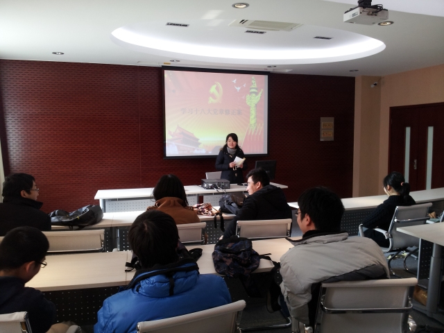 ur2young 在 07/01/2013 - 12:00 提交 当前位置成人导航 » 成人导航动态 成人导航 物流09学生党支部学习十八大党章修改内容 ur2young 在 周一, 01/07/2013 - 14:37 提交 12月25日上午,成人导航 物流09学生党支部在成人导航 楼开展学习十八大党章修改内容的组织生活会。本次组织生活会由支部书记杨玉洁同学主持,成人导航 物流管理09学生党支部成员参与了本次活动。活动开始由支部成员丁舒心同志向大家介绍了党章修改的主要六个方面,并阐述了十八大对党章修改和完善的重要意义——十八大对党章的修改和完善反映了中国共产党对党的建设规律不断地进行探索的勇气,是党的理论与时俱进和丰富发展的重要体现。接着支部成员对十八大党章修改纷纷汇报了自己的学习心得。