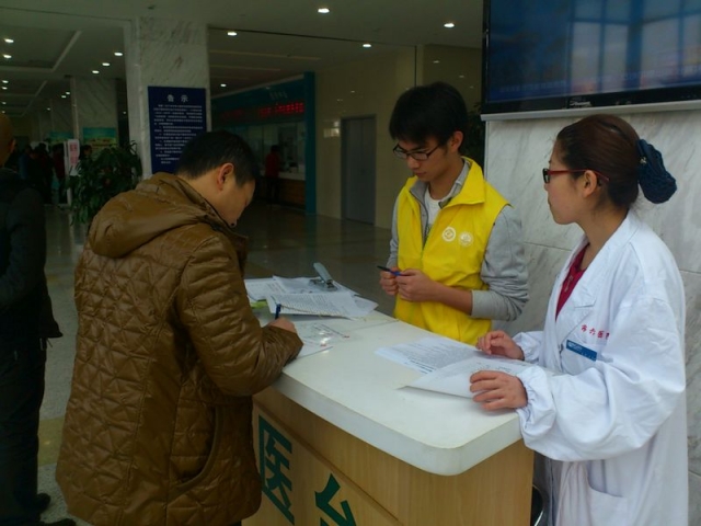 早上7:30,志愿者们就在海大3号门集合,一起出发前往市六医院。8:00准时到了医院,换上了统一的衣服,在导医的指导下,10名志愿者分别了解了各自的工作。预检台的工作又细又杂,在导医的帮助下,刚开始还未熟悉工作的志愿者慢慢找到了感觉;在自动挂号机的志愿者,用心学习,逐渐能够熟练的帮助病人完成挂号;开始时,引导的志愿者还需要看着指示牌来带领病人,后来,当病人问起时,他们几乎可以条件反射的指出正确方向;排队挂号处帮忙管理的工作并不需要什么技巧,但是志愿者以饱满的热情面对这单调枯燥的工作,一丝不苟。