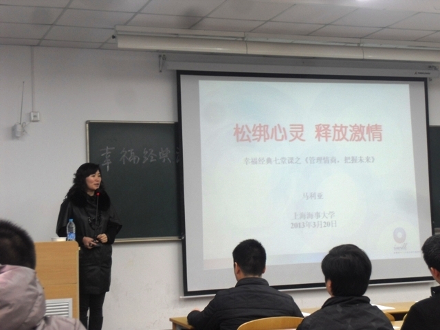 2013年3月29日,我院特邀美国ACI国际注册心理咨询专家、中国幸福心理学专家、青年创业导师、现任爱唯尔iwill(上海)企业发展有限公司CEO马利亚老师主讲《管理情商,把握未来》专题讲座。成人导航 全体心理委员以及心理知识爱好者130余人参加了本次讲座。