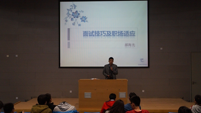 首先,郝海光老师向交运、物流10级以及交运12级专的学生们详细讲解了面试的考察内容,包括仪表举止、教育背景与工作经验、言语表达、人际交往意识与技巧等方面,让大家提前了解面试所考察的内容。接着郝海光老师向学生们强调了面试前准备工作的重要性,并通过素质模型构建方法以及视频资料给大家提供了一些切实可行的建议。