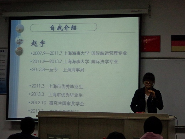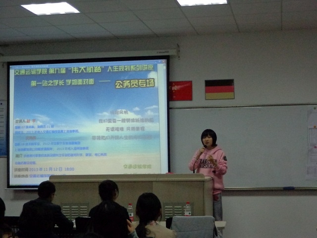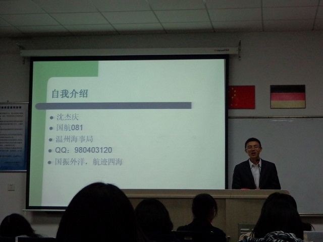 成人导航 第九届“伟大航路”系列讲座第一站——学长学姐面对面公务员专场讲座于11月12日18:00在交运楼115室圆满完成;本次活动由陈莉老师主持, 邀请校友赵宇及沈杰庆与同学们分享公务员考试的经验和心得,赵宇本科毕业于国航07级,海商法11级研究生,并于2013年考入交通运输部直属上海海事局;沈杰庆本科毕业于国航08级,2012年任职于安徽海螺集团上海海螺物流公司煤炭调度岗,于2013年考入温州海事局,讲座现场座无虚席。