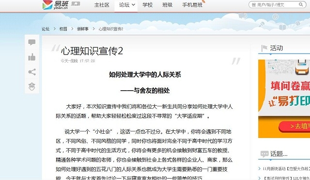 为了宣传大学生心理知识,预防大学生心理问题,11月25日晚开始交运学院于易班平台上开展了首期日常心理知识宣传活动,本次活动覆盖交运学院所有大一新生。