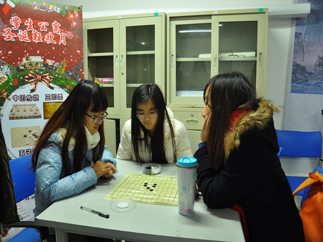 2013年12月25日星期三,由34-35学生自主管理委员承办的学生公寓圣诞狂欢月系列活动之三棋挑战赛在宿舍楼楼会议室正式开战了。此次“圣诞大战”的主要目的有两点:一来希望能在这一年一度的圣诞节给大家多添些喜庆愉快的气氛;二来在这紧张枯燥的期末冲刺阶段,能够让大家轻松愉悦一下更好的提高复习效率。