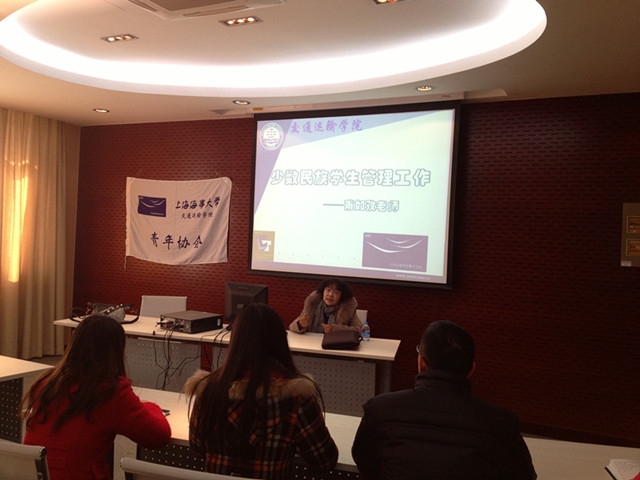 2013年12月31日上午10:00,成人导航 青年协会邀请甫如孜·霍加老师在交运楼213进行“少数民族学生管理工作”的专题讲座。交运学院党委副书记赵睿老师、团委书记曾令伟老师及各位辅导员参加了此次讲座。
