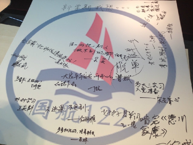 首先,王学锋老师开门见山向同学们提出要求:在休息好的前提下紧抓学业,积极参与诸如“挑战杯”、科创的学术活动,积极撰写论文,强调了创新的重要性,此外,经验丰富的王老师提出了“玩与学结合”的理念,以亲身经历和未来计划刷新了同学们对航运业的看法。接着,朱红红辅导员对国航122班上学期的努力表示了赞扬,并提出了新的要求,希望能办出更多的活动,保持并减少班级的挂科率,争取成为年级甚至全校的领头羊。最后,班长姜天依介绍了这学期新转来的同学,并用ppt的形式带领全班同学回顾了上学期的各项活动,以签名留言的方式让全班同学在巨大的班徽KT版上写下了新学期的计划,以便在期末检测是否实现。