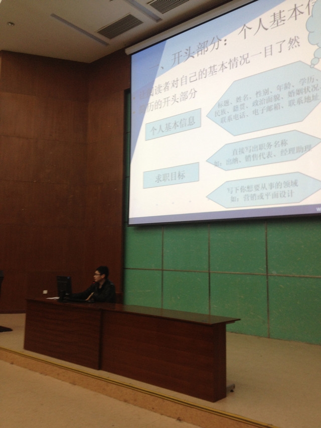 首先,徐老师向学生们强调了简历对求职的重要性,并通过相关案例以及图片资料让同学们有了更为真切的认识;接着,徐老师结合历届毕业生就业的情况,针对目前求职过程中存在的突出问题进行了深刻剖析,围绕职业的选择,个人简历的制作,求职技巧等几大方面,并结合具体事例为同学们做了生动、具体的讲解,重点对学生简历制作中的常见错误作了详实的点评和分析,希望同学们要以认真的态度对待简历制作这项工作,从而为自己的求职打好基础。最后,徐老师以一些优秀简历为样板为大家具体讲解了简历的制作技巧与注意事项。
