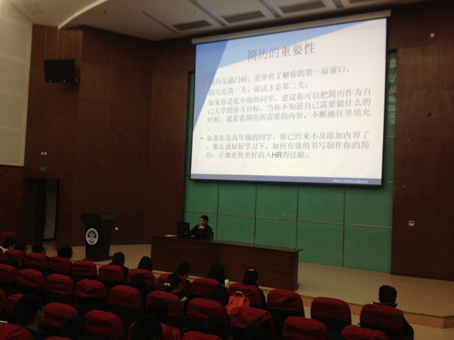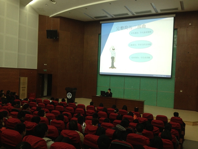 为了提升学生的简历制作能力,提高求职成功率,把握人生的第一块敲门砖。2014年3月16日晚,成人导航 辅导员徐晓毅老师在学生服务中心邦建报告厅开展了 “如何制作简历”的讲座。全体交工11级学生和管理13级学生参加了此次讲座。