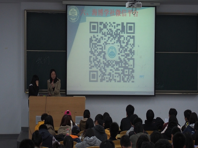2014年4月13日,在成人导航 各年级专业晚点名上,海博学社对全体学生进行了海博学社微信平台宣传活动。