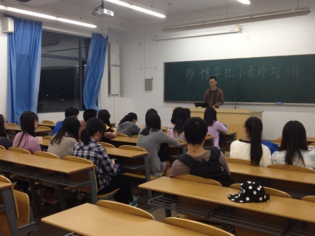 会议的第一部分中,海博学社社长对小老师提出了具体要求:小老师们需要事先温习书本,熟练地掌握并且运用知识点;上课前应准备好PPT课件,课件内容包括:基础和重点知识点展示,经典例题,以及由易到难的知识点配套练习题;拥有强大的心理素质是小老师们的必修课——在授课的过程中要学会克服紧张心理;小老师在上课的时候应注意和同学间的互动,及时为同学们答疑解难,提高同学们听课注意力,从而使同学们更加高效地掌握知识。第二部分中,学术部部长从细节着手,补充了社长的发言:他列举了一些上课时该注意的细节,并给每位小老师分配了本学期教学任务。