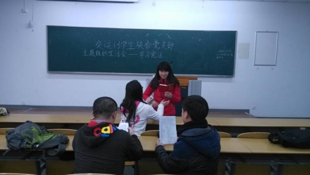 2014年12月2日下午16:00,交运13级学生联合党支部“宪法日”宪法学习活动在教学区3A102成功开展。本次活动由支部书记张江梅主持,党支部的5名学生党员参与了本次宪法学习活动。