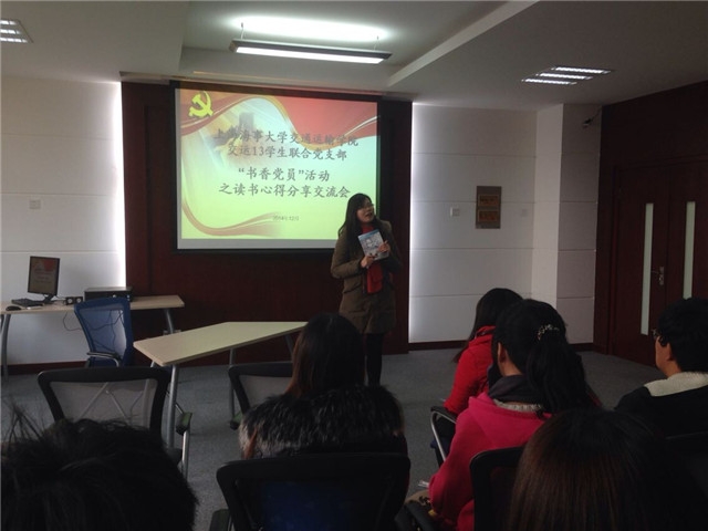 “书香党员”活动作为交运13级学生联合党支部的精品活动,自活动之初就得到了学院领导、老师和同学们的大力支持。本次活动共分为三部分。第一部分:支部书记张江梅同志就本次活动做了简单介绍,鼓励大家在活动中积极发言,与其他同志分享自己的读书感悟。第二部分:五名入党积极分子就自己所阅读的书籍发表读书感言。五名同志的发言或是结合读书内容,或是结合自身实际,其他同学也积极发表自己的心得体会,将活动推向了高潮。第三部分:辅导员老师点评。辅导员刘建老师和郝海光老师不仅和大家交流了自己的读书体会,还向在场的同志推荐了很多好的有意义的书籍,并鼓励大家“读万卷书,行万里路”。