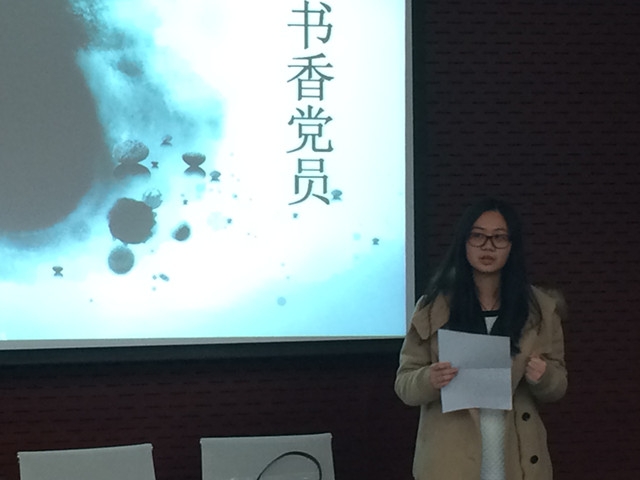 活动一开始,国航12党支部书记朱红红老师便对“书香党员”活动进行了鼓励和强调,明确了阅读的重要性以及党员、入党积极分子提升思想觉悟的必要性。接着,由党支部选出的10篇优秀读书笔记的作者一一向同学们介绍他们阅读的书并交流了自己的感悟。整个交流过程中,10位交流者用或引经据典或声色并茂的演讲指引着每位听众领悟不同的书带来的不同的故事和不同的思想意义。其中,陈澜芝同学介绍的《软实力》、赵梓妍同学介绍的《幸福就这么简单》等普遍受到欢迎,台下反响热烈。
