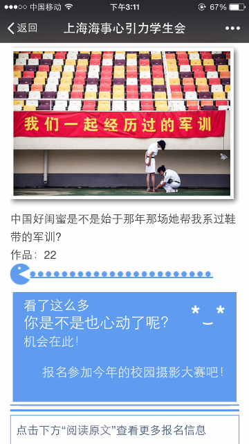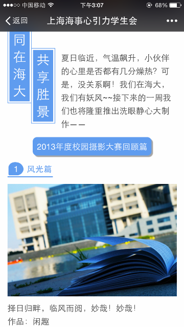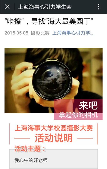 在活动的推广上,心引力学生会不仅制作海报在北广张贴宣传,同时也利用晚点名在不同的学院进行了宣传介绍。近期,在心引力微信公众号上也开展了以“朝花夕拾,写意海大”为主题的往届优秀获奖作品的宣传,充分响应“四进四信”之“进网络”的号召,运用网络平台,结合时代发展趋势,吸引更多学生参与进来。