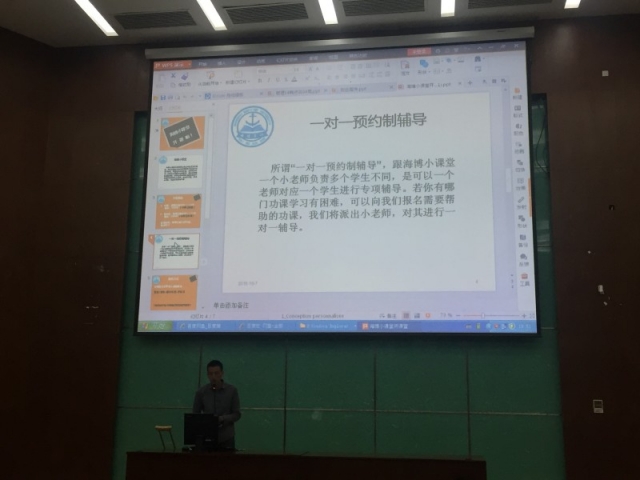 2015年10月7日晚,成人导航 各专业利用晚点名时间进行了海博课堂的宣讲。此次宣讲会由成人导航 各辅导员进行,由海博学社制作PPT。