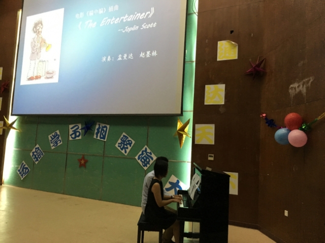 开场,交规15的两位同学就以钢琴四手联奏的形式,演绎了一曲《The Entertainer》,一下子吸引住了观众们的眼球;随后,6位同学的火星舞表演,呆萌可爱,生动有趣,爽朗的笑声响彻整个报告厅,现场气氛达到高潮。后续的表演环环相扣,歌曲串烧清新迷人,小品幽默风趣,主持人妙语连珠,更有“吉祥物大白牙”客串演出,与演员们深情拥抱、献礼,惹得观众们多次捧腹大笑。