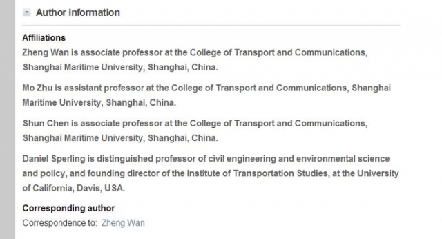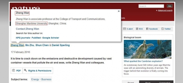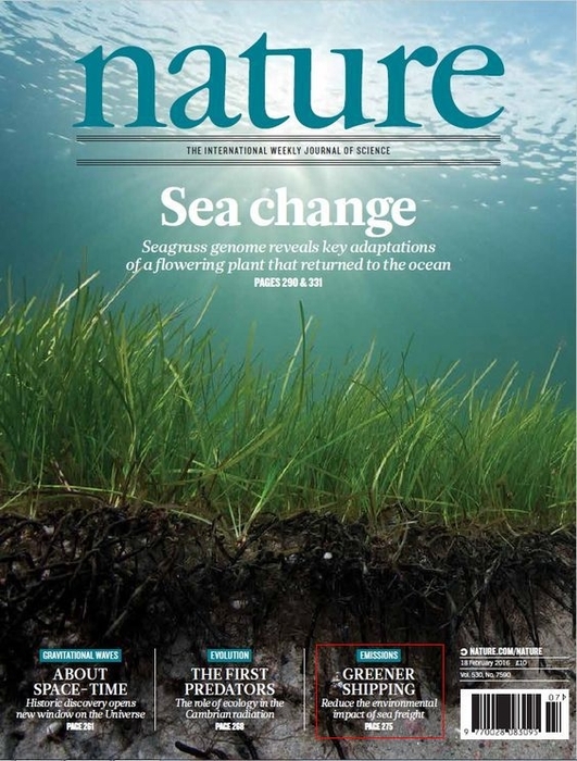 2016年2月18日出版的 《自然》(Nature)期刊刊登了成人导航 万征、朱墨、陈舜老师和加州大学戴维斯分校Daniel Sperling教授题为《Pollution: Three steps to a green shipping industry》的评述文章(comment)。这是我校学者首次以第一作者和通讯作者身份在《自然》上发表评述文章。Nature每期仅刊登1-2篇长评述(comment),本评述是当期《自然》的封面导读文章,编辑部还为本文制作了音频采访节目。(Nature 530, 275–277 (18 February 2016) doi:10.1038/530275a)