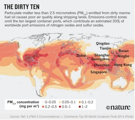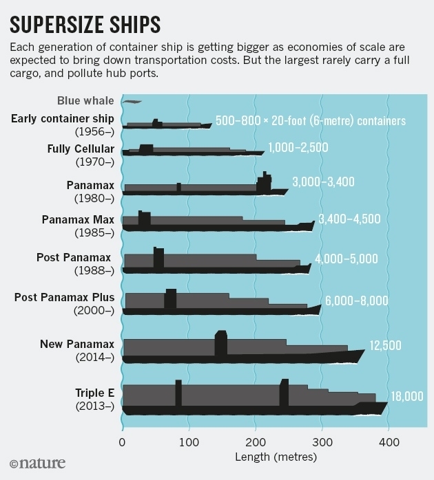就单位能耗和排放而言,航运是最节能环保的运输方式。然而大型集装箱船舶的环保优势并不能改变航运业高污染的事实。大型船舶排放对港口城市造成了严重的污染。以香港为例,船舶排放的空气污染物约占其城市总量1/3至一半。全球范围内每年由船舶排放的颗粒物导致的心肺疾病和肺癌死亡人数达到了60,000例。为了能够接纳超大型船靠泊,港区不断地扩建,严重破坏了岸线生态系统。同时废旧船舶的拆解也对当地的水域和土壤造成了污染,危害着发展中国家工人的健康。