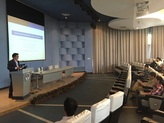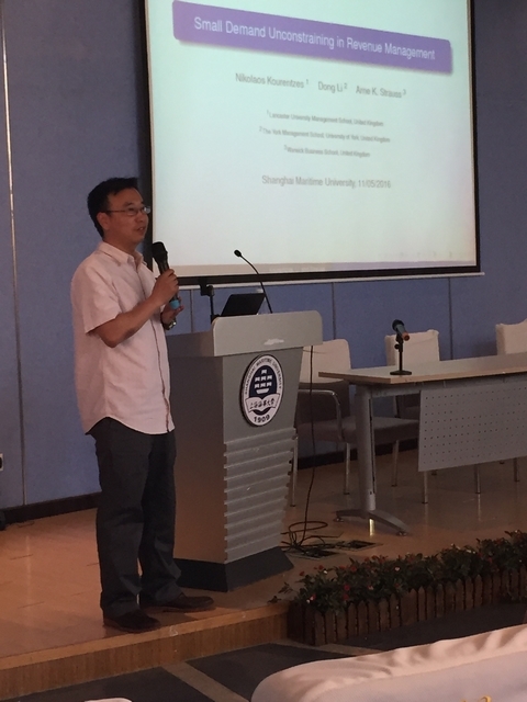 2016年5月11日下午,英国约克大学管理学院Li Dong 博士应邀来在成人导航 报告厅为我院师生做学术报告,学术报告的题目是“Small Demand Unconstraining Methods for Revenue Management Systems "(收益管理系统的小量需求无约束需求预测方法研究)。该讲座主要介绍收益管理的主要内容和研究方法。Li Dong 博士罗列需求不确定下的需求预测方法,根据他的研究内容,提出小需求量背景下的需求预测模型,以汽车租赁公司的不同租赁时间的需求量预测为例,确定汽车租赁公司的汽车保有量,并通过对比已有的研究方法,验证小需求量预测方法取得良好的经济效益。