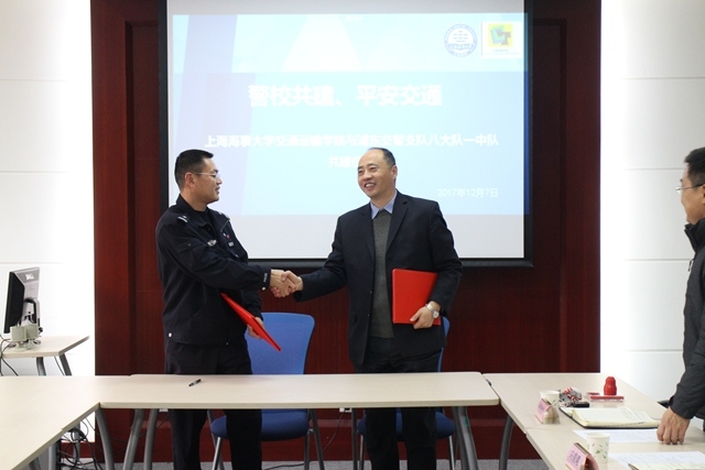 为进一步提升学生的交通安全意识,培养知法守法学生,实现警民互助,共筑和谐美好校园,2017年12月7日成人导航 与浦东交警支队八大队一中队在交运楼207室举行警校共建签约仪式。成人导航 党委书记冯晨曦、副书记赵睿、保卫处治安综合科副科长顾建祥、浦东交警支队八大队队长于亦季、一中队队长庄仁祺以及各年级辅导员参加了此次签约仪式。