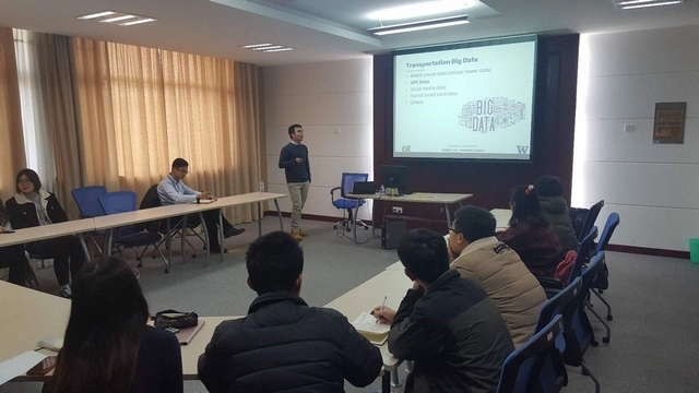 ur2young 在 周五, 12/22/2017 - 11:14 提交 12月20日下午,我院邀请华盛顿理工大学王靖兴博士做了关于“交通领域大数据处理与应用”为主题的学术报告,报告由我院于尧老师主持。报告以美国联邦公路管理局委托华盛顿大学承担的课题为依托,以大数据应用过程中存在的问题和不足为切入点,对GPS大数据和手机信令数据等多源数据的特征差异进行了分析,并着重讲解了数据的处理方式和可视化结果差异。报告内容引发了学生们的积极思考,并就报告内容与王博士进行了深入的交流。现场气氛热烈、活跃。