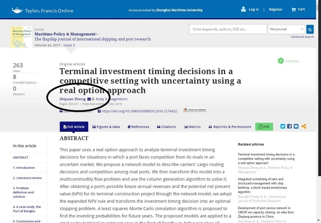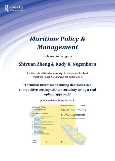 SSCI期刊《Maritime Policy & Management》刊登了2017年度候选最佳论文(共8篇),其中之一是成人导航 郑士源教授发表的题为“Terminal Investment Timing Decisions in a Competitive Setting with Uncertainty Using a Real Option Approach”的学术文章。