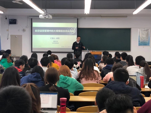 2018年11月14日下午1:30, 同济大学梁哲教授来访我院,并在教学楼2B205教室作了题为“航空运营管理中的大规模组合优化问题”的学术报告。此次报告以航空运营管理优化为主题,吸引了包括学生和教师在内的百余人前来分享他的研究成果。