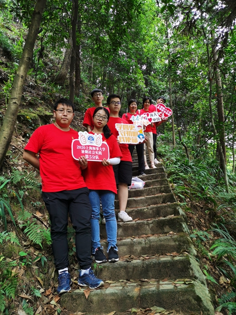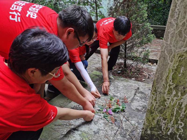 随后,实践队前往位于重庆南山凉风垭森林公园内的周均时墓。沿着弯弯绕绕的青石板路行走了20余分钟,终于寻到了周均时校长的墓。在绿树林荫之下,斑驳的阳光投射到墓碑之上,地上的松针与青苔诉说着这里光阴的故事。在墓前矗立着一块诉说周均时老校长生平功绩的石碑,扫去石碑上的落叶,可以清晰看到上面记载着的周均时老校长半世纪的人生中为国家、为民族所做的贡献。全体实践队员为周均时老校长献上鲜花,送上我们的祝福。据资料显示这是周均时老校长的弟弟在中华人民共和国成立之后将周均时的墓地迁入这个地方,安葬在此处。