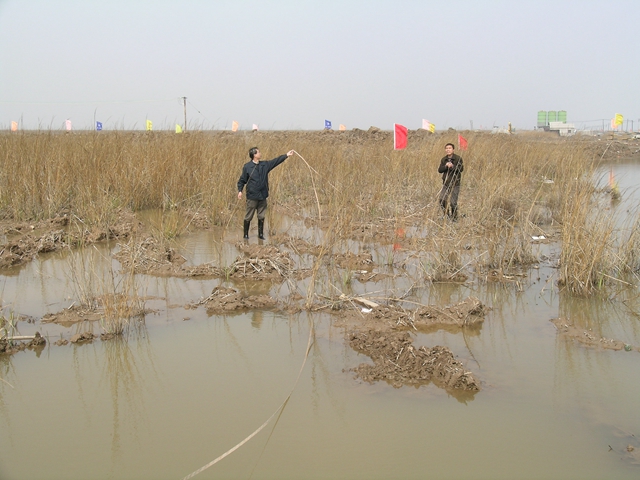 2005年2月后勤中心杨文忠(左)与张永兴(右)在现场规划苗圃