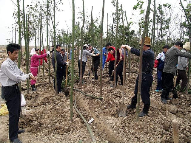 2位年轻人入住此处后,我们又动员了1对农民工夫妻进入苗圃工作。在张永兴的带领下,工作很快有序展开。先完成了苗圃土壤性状的调查,绿化地的精耕,进行了首次施肥和去碱任务。4月中旬,后勤中心组织所有干部加上部分绿化工到现场进行了义务植树,种下了第一批150棵多个品种的实验苗木。在落日的余晖下,原来一片荒芜之地第一次有了生机!