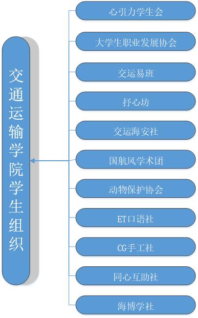 成人导航 团委下属各类学生组织11个,包括学生综合服务类、文体类、学术类等,由学院团委统一管理。现参加各学生社团组织的学生人次约550人,各类社团组织活动形式众多,已覆盖20%以上的交运学生。ET口语社、 CG手工社、动物保护协会曾多次被评为成人导航 四星社团。一直以来,学院内各学生社团组织始终发挥着凝聚学院学生、繁荣校园文化、推进校园民主、加强道德教育和拓展青年视野的作用,丰富了学生的校园生活,已日益成为深化“大学生素质拓展计划”的重要载体,充分发挥学生社团组织在大学生思想政治教育和综合素质培养中的独特作用。树立和宣传我校学生社团组织的先进典型,展现我院学生组织的时代形象,使学生社团组织成为大学生展示才艺、增长才干、磨练意志、锻炼能力的舞台是每个社团组织孜孜不倦追求的目标。我院始终秉承着“影响、传承”的精神,贯彻“服务社团、建设社团、树立品牌、办出特色”的方针,不断开拓创新,发挥服务社团组织的功能,使学生社团组织成为学校课堂教学之外的有益补充和促进校园文化建设的重要力量。