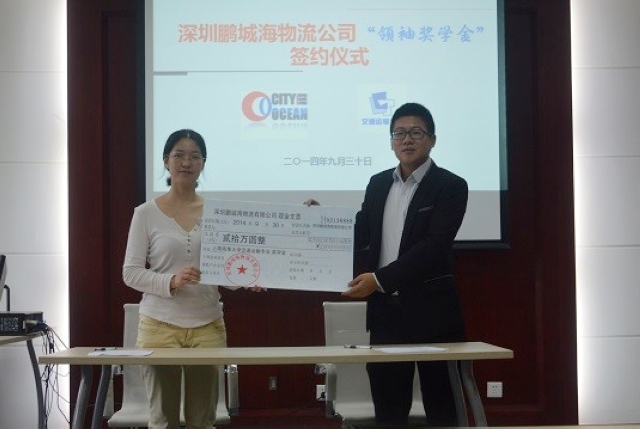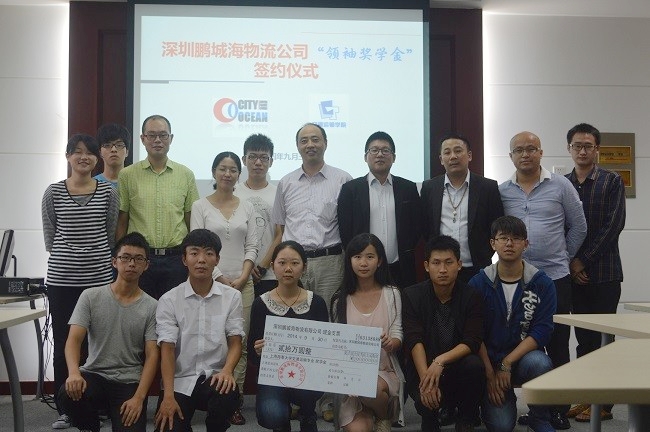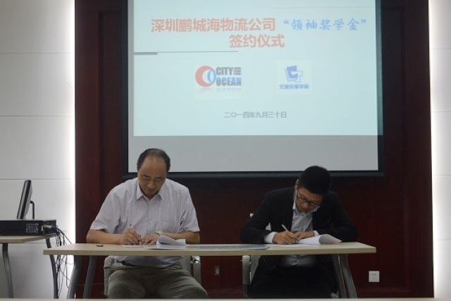 2014年9月30日上午10:30,深圳鹏城海物流有限公司在我校成人导航 交通运输专业设立的“领袖奖学金”签约仪式在交运楼207举行。院党委书记冯晨曦老师、党委副书记赵睿老师、学生资助中心主任相雷老师、深圳鹏城海物流有限公司华东区总经理郁凯宇先生、市场部经理虞恩华先生以及交运专业学生代表参加了签约仪式。签约仪式由成人导航 团委书记曾令伟老师主持。